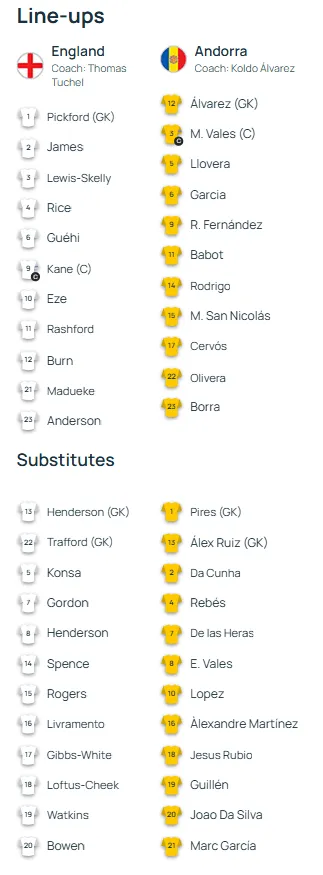虎扑09月06日讯 世界杯欧洲区预选赛,英格兰vs安道尔将于北京时间0点开战,赛前双方公布了首发名单。