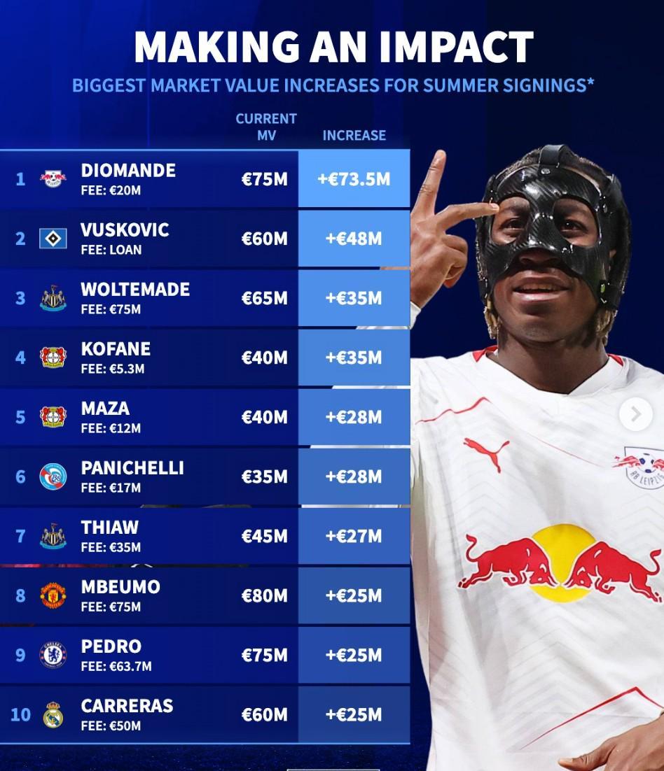 北京时间4月28日,德转列出了去年夏天各俱乐部新援本赛季的身价涨幅榜,RB莱比锡边锋扬-迪奥曼德以暴涨7350万欧元高居第一,沃尔特马德、姆伯莫、若昂-佩德罗以及阿尔瓦罗-卡雷拉斯上榜。