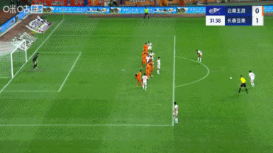 比赛第32分钟,亚泰队获得任意球,张华晨主罚射门直挂球门死角,皮球弹框入网,长春亚泰开局1-0领先!